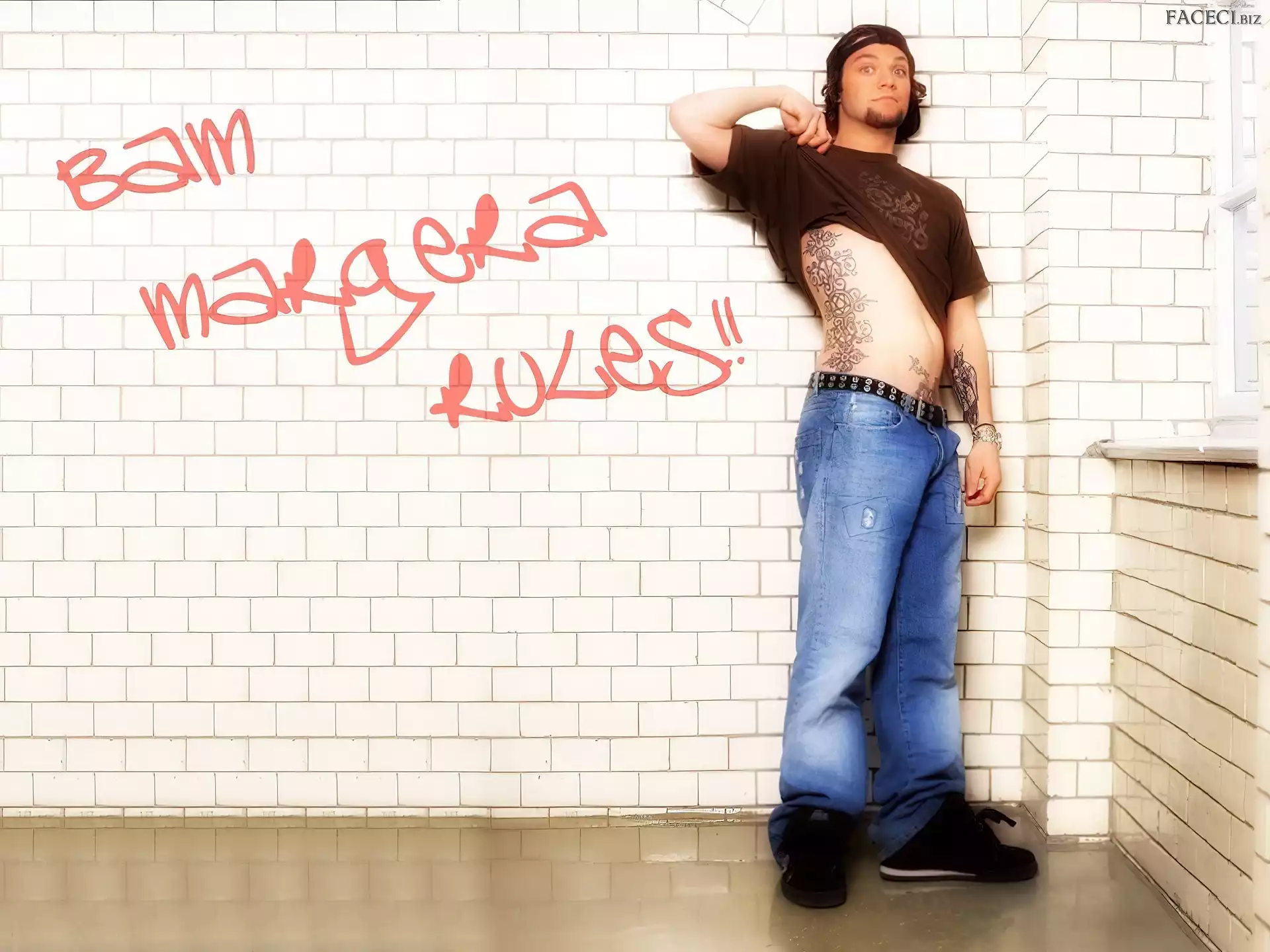 t-shirt, Bam Margera, brązowy okulary, Bam Margera, twarze zegarek, Bam Margera, deskorolka kurtka, Bam Margera, rozpięta okulary, Bam Margera, butelka włosy, Bam Margera, ciemne